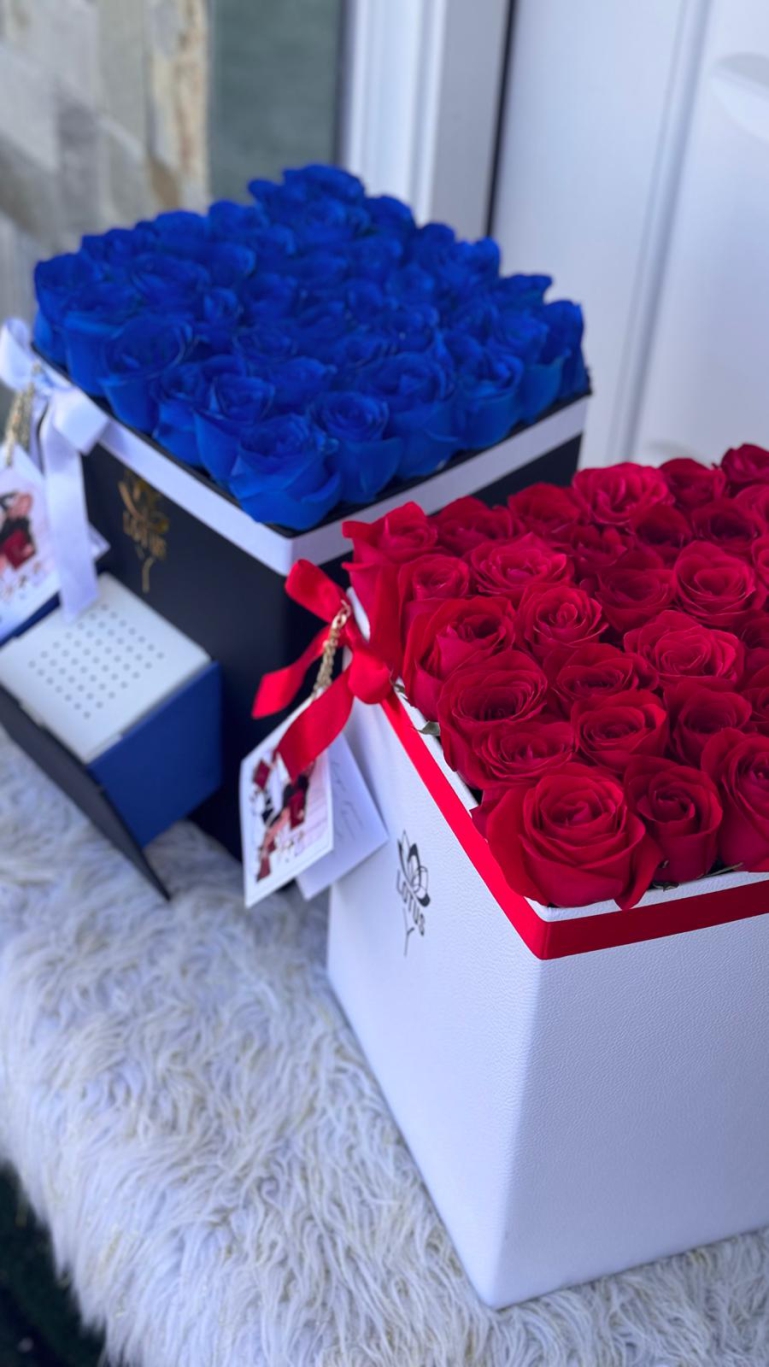 Un regalo que combina romance y dulzura. Nuestra caja cuadrada con 30 rosas naturales incluye un compartimiento de dulces, disponible en colores dorado, negro o rojo, perfecta para sorprender con estilo y amor.
