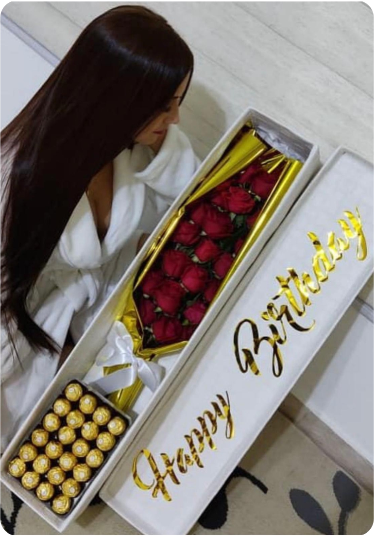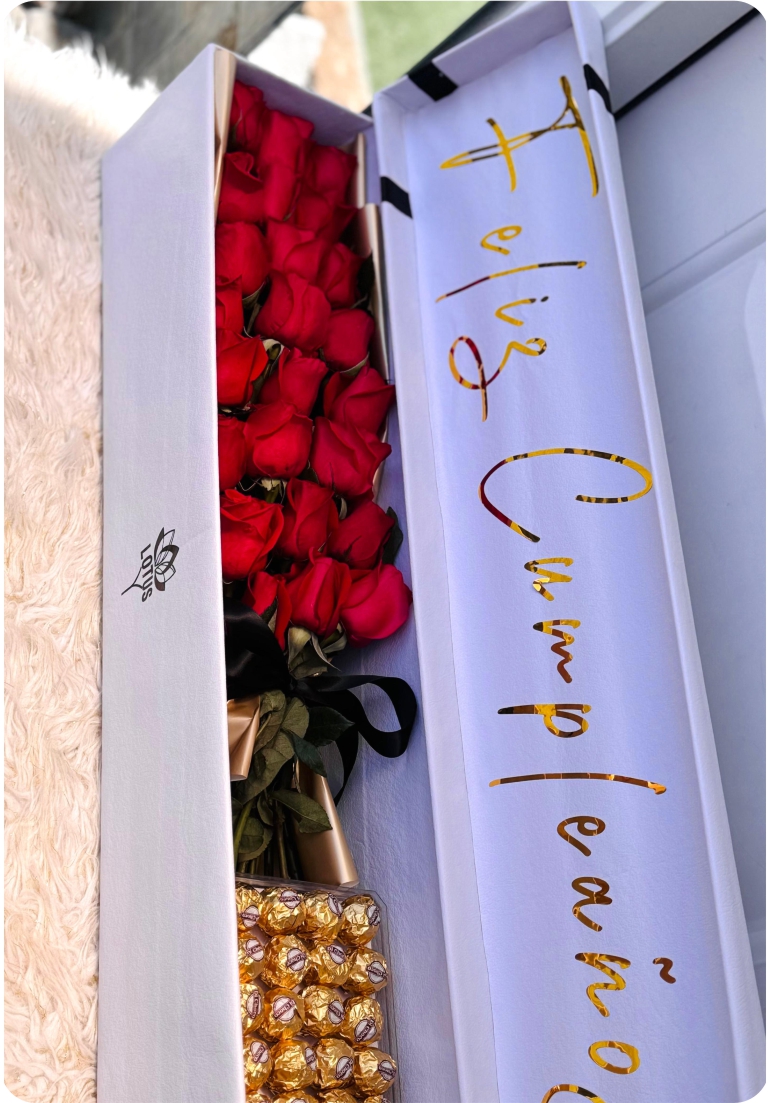 Cada pieza combina rosas naturales frescas con chocolates Ferrero Rocher originales, presentados en un estuche elegante y personalizable que resalta por su estilo moderno y sofisticado.